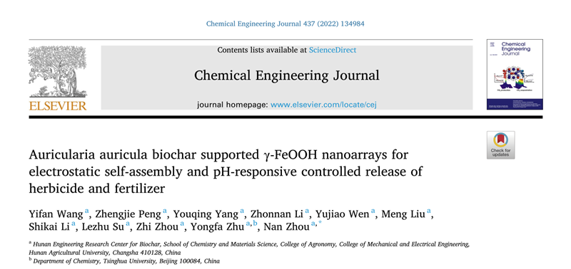 近日,球盟会农用化学材料学科交叉联合实验室在综合领域高水平刊物Chemical Engineering Journal (IF=13.273)杂志在线发表题为“Auricularia auricula biochar supported γ-FeOOH nanoarrays for electrostatic self-assembly and pH-responsive controlled release of herbicide and fertilizer”的研究论文。如今,过量药肥的滥用造成了严重的资源浪费与环境污染,迫切需要发展新型控释农药/肥料体系。本研究在资源化废弃农业生物质目的的基础上,通过制备复合生物炭材料,可与典型农药(除草剂二氯喹啉酸)和肥料(磷素)形成静电自组装结构,并实现pH响应调控释放。在实际土壤或水培环境中,本研究得到的新型材料可结合环境中已存在的有效磷,并且可对稗草进行选择性去除。此工作不仅为农药和肥料的控释设计了一种有效的材料与方法,对于后续控释材料开发及实际环境施用提供了新思路,并在农业生物质资源利用方向取得新进展。